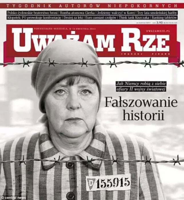 Канцлер Германии Ангела Меркель попала на обложку известного польского журнала Uwazam RZE, который изобразил ее в виде узницы концентрационного лагеря, пишет The Daily Mail. Канцлера одели в полосатую робу и поместили за колючую проволоку. Завершает композицию заголовок "Фальсификация истории... Как немцы сделали из себя жертв Второй мировой войны". Таким образом поляки ответили на немецкий фильм "Наши матери, наши отцы", показанный в конце марта телеканалом ZDF. В ленте бойцы польского сопротивления были изображены как ярые антисемиты. Польские дипломаты уже назвали образ борцов польского сопротивления "крайне несправедливым и оскорбительным". В свою очередь продюсер фильма Нико Хофманн объяснил, что изображенные в ленте события "основаны на проверенных исторических материалах и не преследуют цель опорочить поляков".