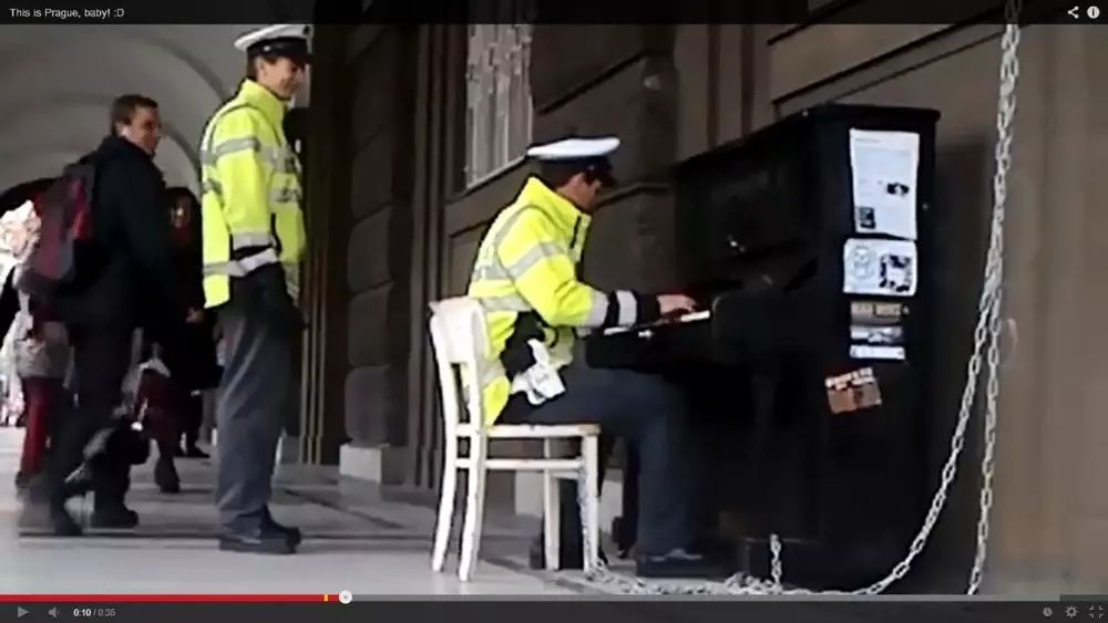 Чешский полицейский стал самым знаменитым стражем порядка в стране после того, как в Сеть выложили ролик с его участием, сообщает BBC. Во время дежурства он сел за пианино, которое установлено в центре Праги, и сыграл композицию River Flows in You южнокорейского композитора Yiruma.