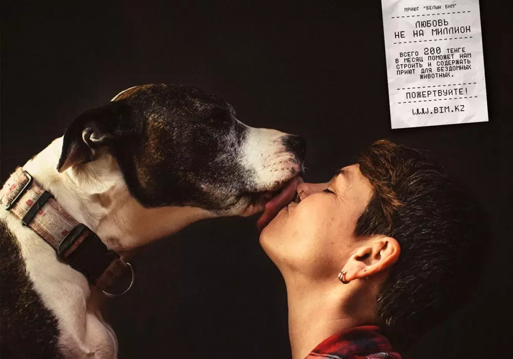 Автором снимков является американский фотограф Крис Семброт, с согласия которого креативщики рекламного агентства Openeyes DDB и запустили кампанию по сбору средств на содержание приюта для бездомных животных "Белый бим". Слоган постера с элементами сарказма называется "Любовь не на миллион". Как рассказал креативный директор агентства Сергей Радионов, идея воплощена на фоне судебных тяжб консерватории имени Курмангазы и авторов скандального постера.
