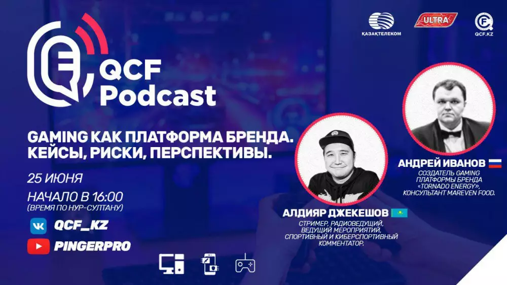 Еще одним спикером первого подкаста станет Алдияр Джекешов – известный в стране стример, радиоведущий, ведущий мероприятий, спортивный и киберспортивный комментатор. Стартовый подкаст пройдет 25 июня в 16.00 по времени Нур-Султана, его трансляция будет доступна по ссылкам vk.com/qcf_kz и youtube.com/c/PingerPro.