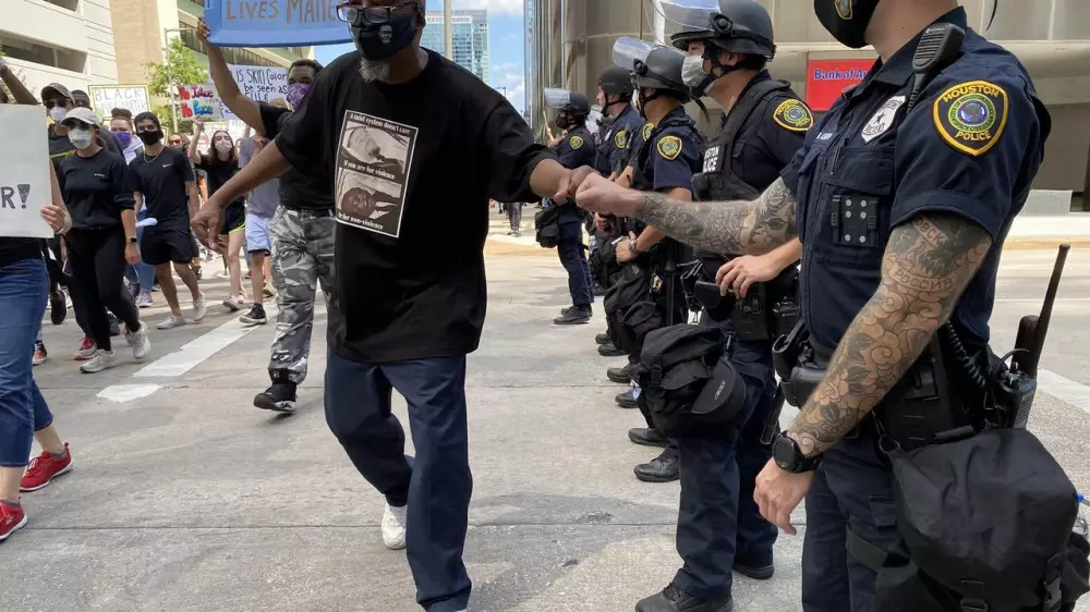POWERFUL PHOTO ?? A man marching to honor George Floyd fist bumps a Houston Police officer while making his way to city hall. Read more here -> https://t.co/GEeMYfcH1u. #GeorgeFloyd #abc13 #hounews pic.twitter.com/3hV0v86USD