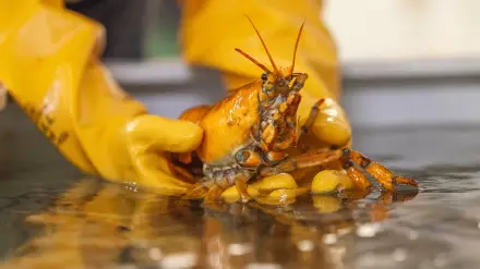 Марли Баббин, рыболов из Tenants Harbor, выловил желтого омара в заливе Мэн. Рыбак сфотографировал необычный улов и передал лобстера в Центр морских исследований и технологий Университета Новой Англии.