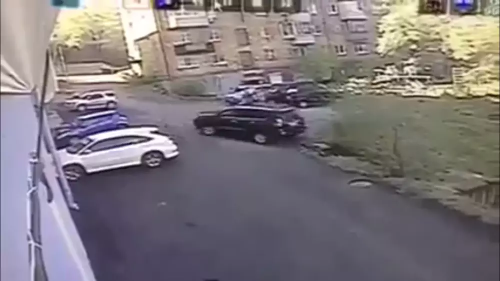 На кадрах видно, как черный внедорожник выезжает задним ходом с парковки во дворе и опрокидывается в кювет через несколько секунд после начала движения.