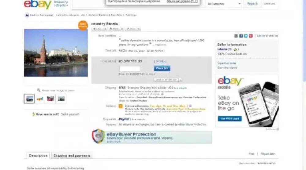 Отметим, что правила аукциона не запрещают выставлять на продажу государства, однако администрация сайта имеет право удалить лот, нарушающий законодательство страны продавца. За то время, что объявление находилось на сайте, Россию оценили в 100 тысяч долларов.