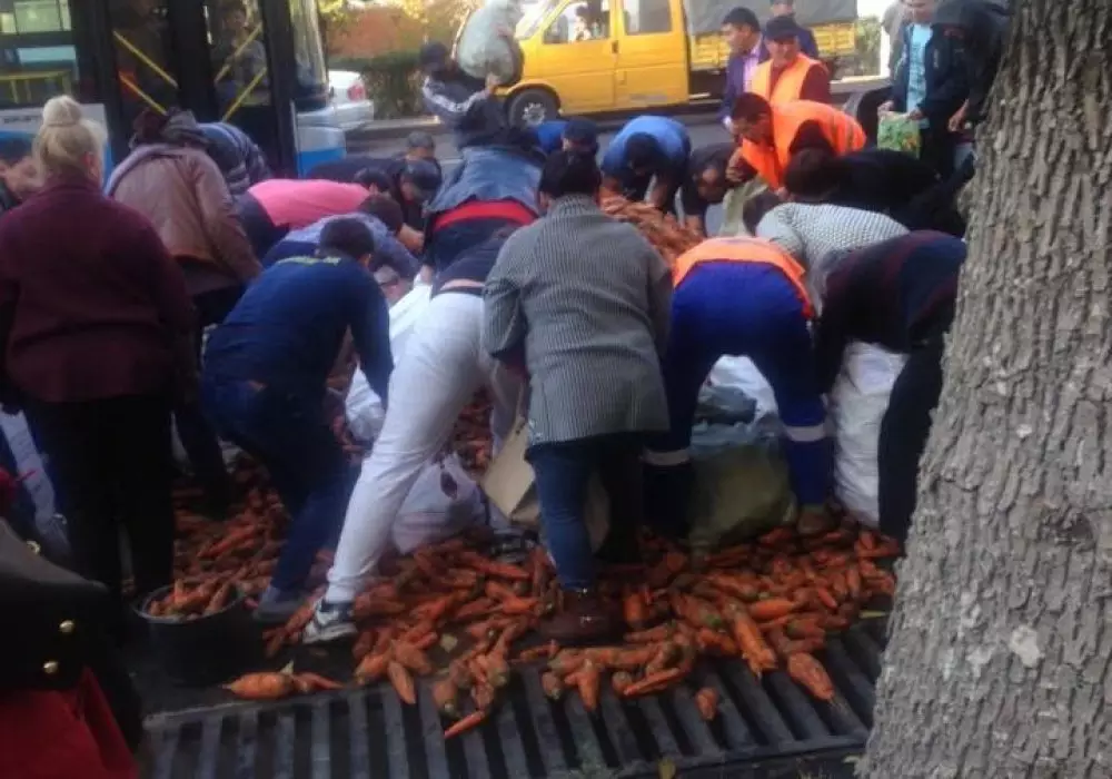 В Алматы водитель КамАЗа высыпал морковь прямо на дорогу, и раздал всем желающим бесплатно, передает Tengrinews.kz.