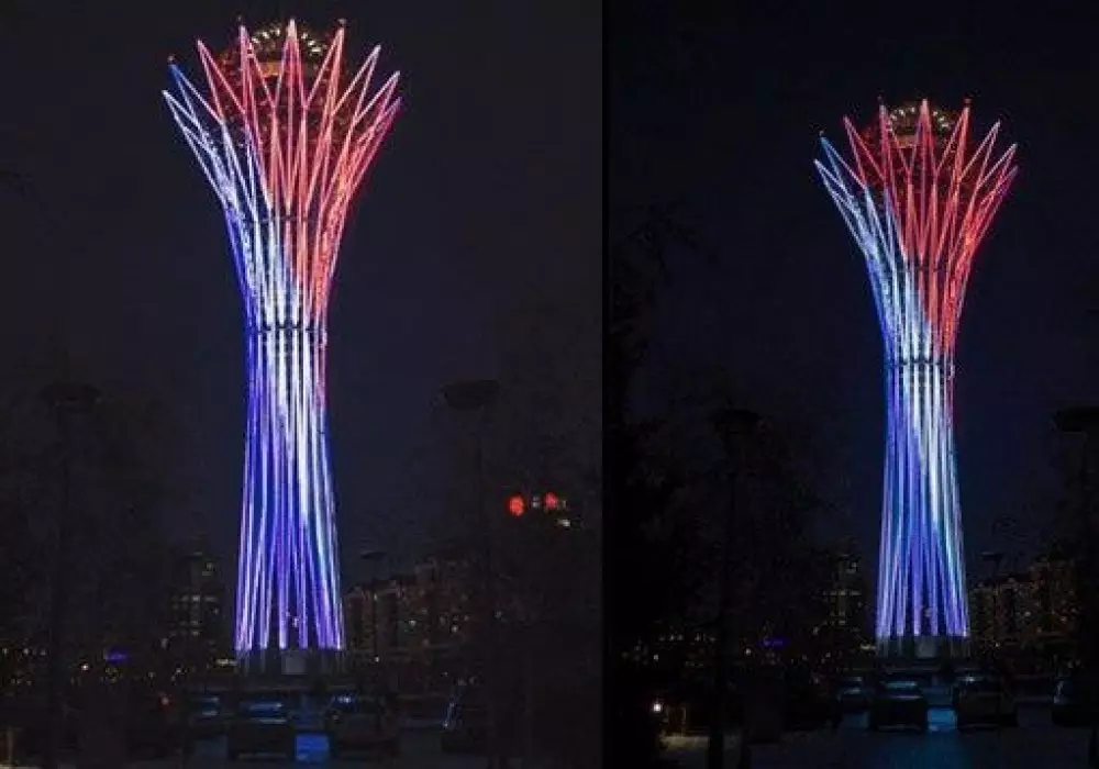 Однако позднее представители "Байтерека" сообщили о том, что монумент в цвета французского флага окрашен не был.