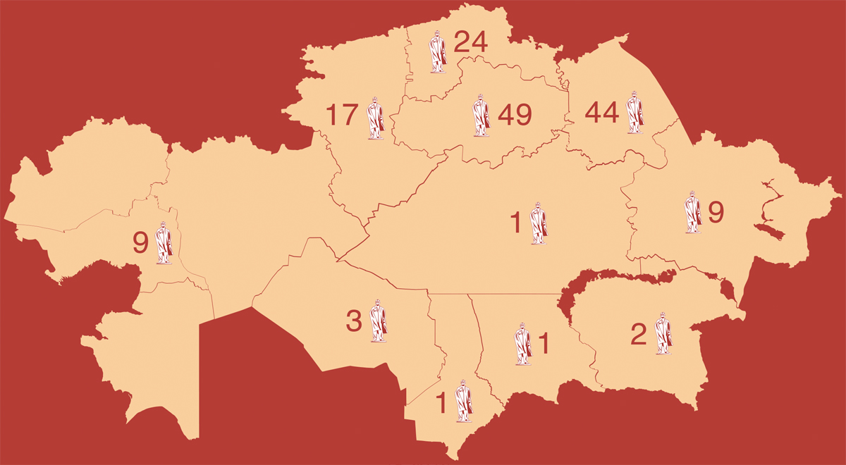 Согласно ответу Министерства культуры и спорта РК, в республике сохранилось 159 скульптурных сооружений, среди которых памятники, бюсты, скульптуры, монументы. Наибольшее количество из них расположено в Акмолинской области - 49, в Павлодарской - 44, Северо-Казахстанской - 24.