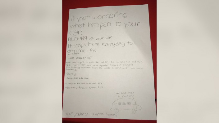 В сообщении девочка описала в подробностях, что произошло. Она рассказала, что вмятину оставил школьный автобус с номером 449. Каждый вечер он привозит школьницу домой. И в этот раз он случайно задел автомобиль Эндрю. Шестиклассница извинялась за произошедшее, а ниже оставила рисунок, который особенно приглянулся пользователям Сети. Она нарисовала маленький автобус с детьми, которые, вероятно, кричали во время инцидента.