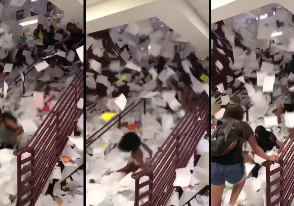 Американские подростки из города Чандлер (штат Аризона, США) в честь окончания школы устроили водопад из своих тетрадей с домашними заданиями, сообщает Mashable.