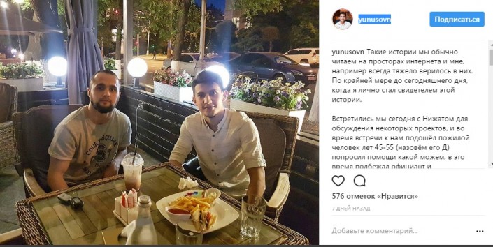 "Встретились мы сегодня с Нижатом для обсуждения некоторых проектов, и во время встречи к нам подошел пожилой человек лет 45-55 (назовем его Д.) попросил помощи какой можем, в это время подбежал официант и администратор, начали прогонять его, но Нижат успокоил их, сказав что все нормально, и спросил у Д., для чего ему нужны деньги. Д. ответил, что хочет кушать. Тут же Нижат попросил его присесть к нам, заказав ему немало еды, мы сидели и слушали историю Д. Он рассказал что приехал на заработки, а его обманули забрав все документы, вещи и деньги. рассказывал как сильно хочет домой, при этом ненадолго останавливаясь, чтобы вытереть слезы", - пишет Nazim Yunusov (орфография и пунктуация автора сохранены).