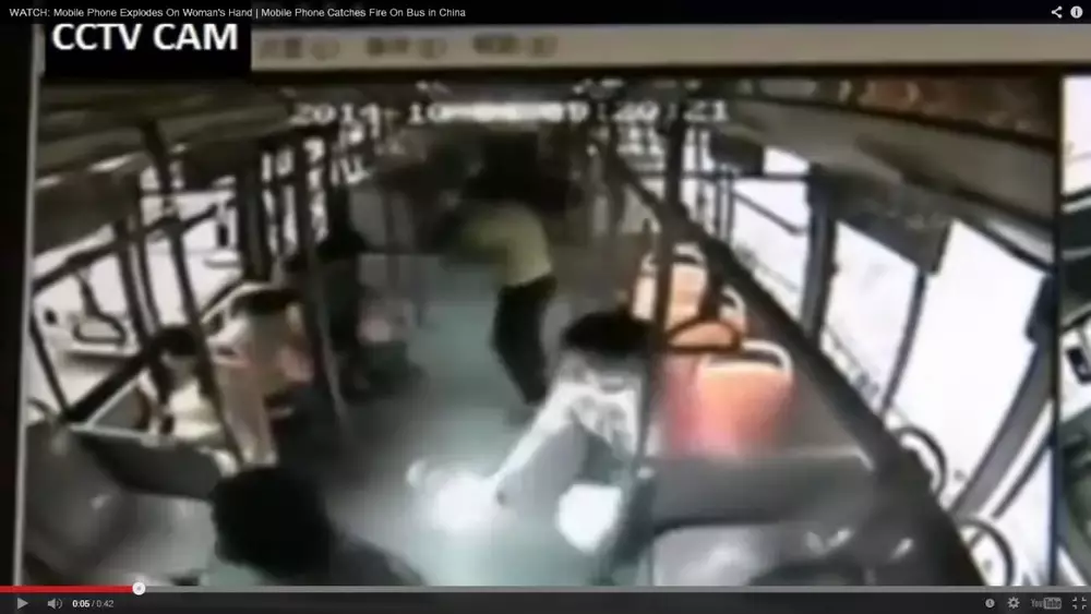 На кадрах с камеры наблюдения видно, как одна из пассажиров автобуса, поговорив по телефону, попыталась заменить батарею устройства. В этот момент женщина увидела перед собой яркую вспышку света, а в руках у нее оказался полыхающий смартфон. После того, как смартфон взорвался, перепуганные пассажиры стали в панике покидать автобус.