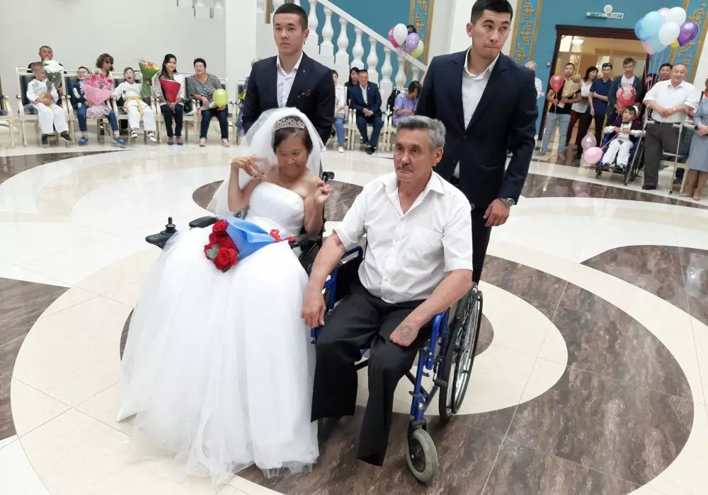 Молодожены живут в доме для престарелых и инвалидов. Свадьбу им помогли организовать десятки добрых людей. Жених и невеста - спортсмены с ограниченными возможностями. Александр Сареев занимается армрестлингом на коляске, его избранница Гульнара Айдаргалиева играет в теннис и шахматы.