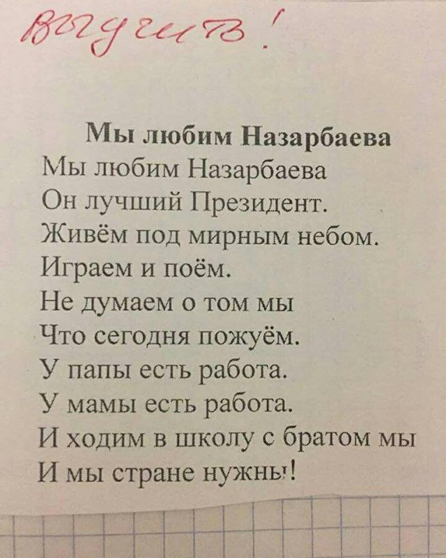 В социальных сетях опубликовали стихотворение о Нурсултане Назарбаеве. "Произведение" удивило как пользователей Сети, так и самого отца ребенка, которому он был задан.