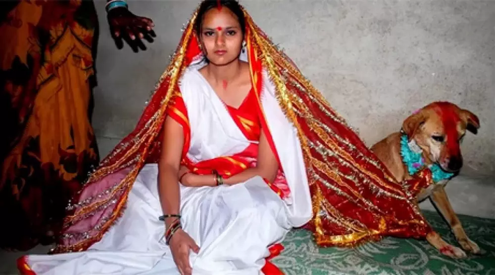 18-летняя индианка по имени Мангли Манда из Джаркханда вынуждена была принять участие в таком странном ритуале, так как на нее наложено заклятие. Так решили деревенские старейшины. Как утверждают мудрецы, только свадьба в Индии с животным помогла бы избавиться от черных духов.