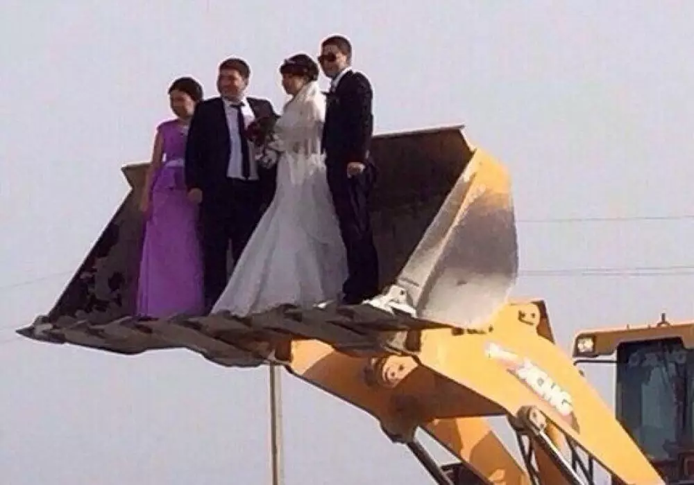 Фотография казахстанских молодоженов, появившаяся недавно в социальных сетях, стала предметом для шуток. На снимке, сделанном предположительно в Актау, жених и невеста вместе с дружкой и подругой сфотографировались в поднятом над землей ковше погрузчика.