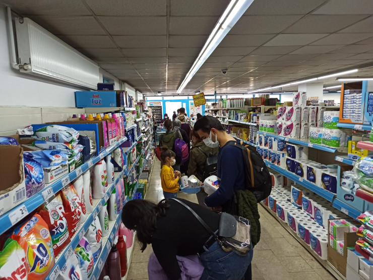 Көшеге 19.00-ге дейін ғана шығуға болса, маркеттер 18.00-де жабылады. Сондай бір маркетте кезекте тұрғандар.