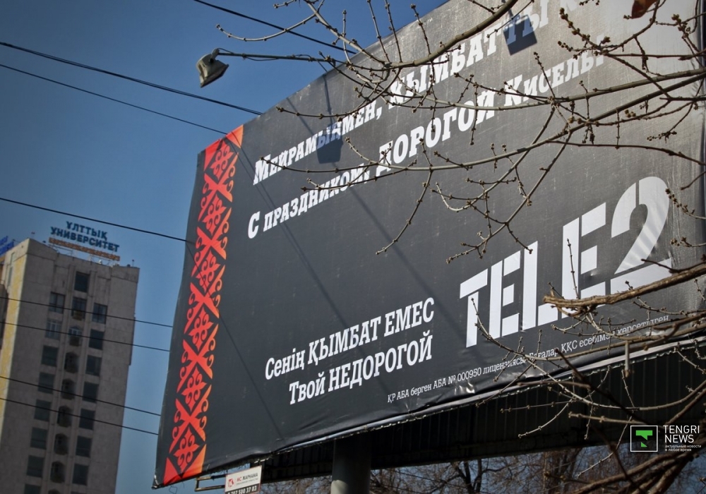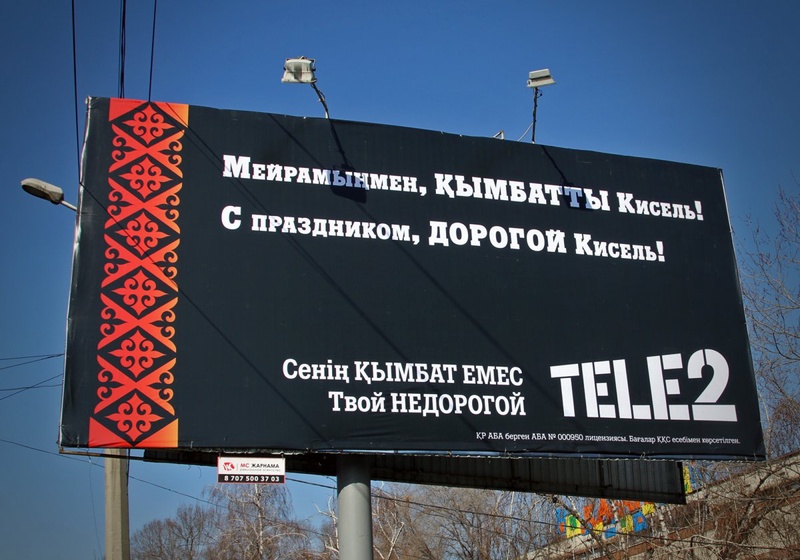 В Алматы появился очередной билборд с провокационной рекламой от сотового оператора Tele2, передает корреспондент Tengrinews.kz. Баннер появился на улице Тимирязева напротив КазНУ имени аль-Фараби. Компания разместила оригинальный билборд, содержащий поздравления с праздником Наурыз для конкурентов. На плакате написано: "С праздником, дорогой Кисель! Твой недорогой Tele2".