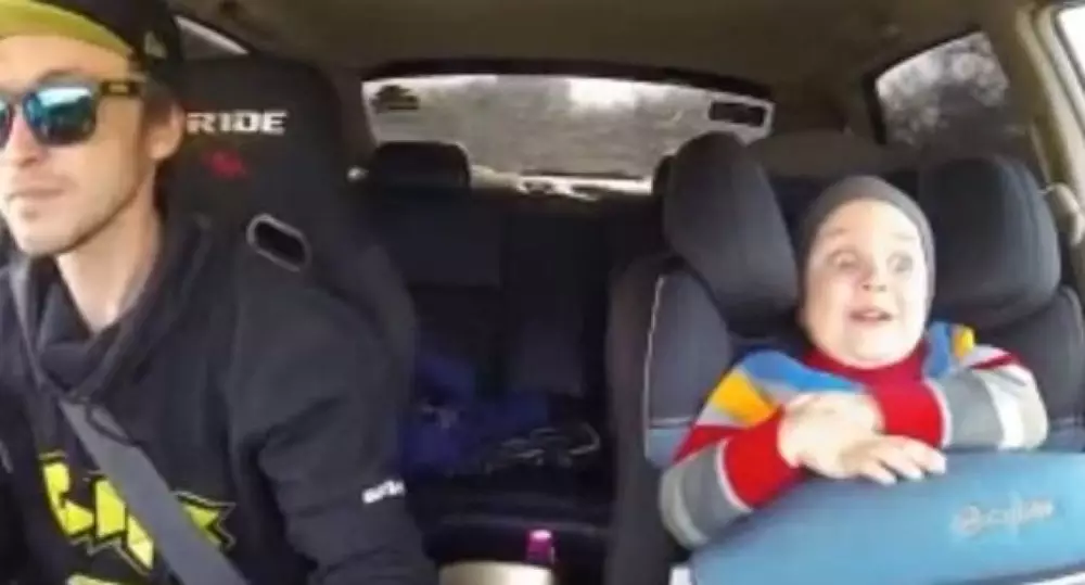 На старте мальчик, сидящий в детском автокресле, выглядит сонным и равнодушным. Однако после того, как папа срывается с места и начинает нарезать круги с профессиональными заносами, не реагировать на это уже невозможно.