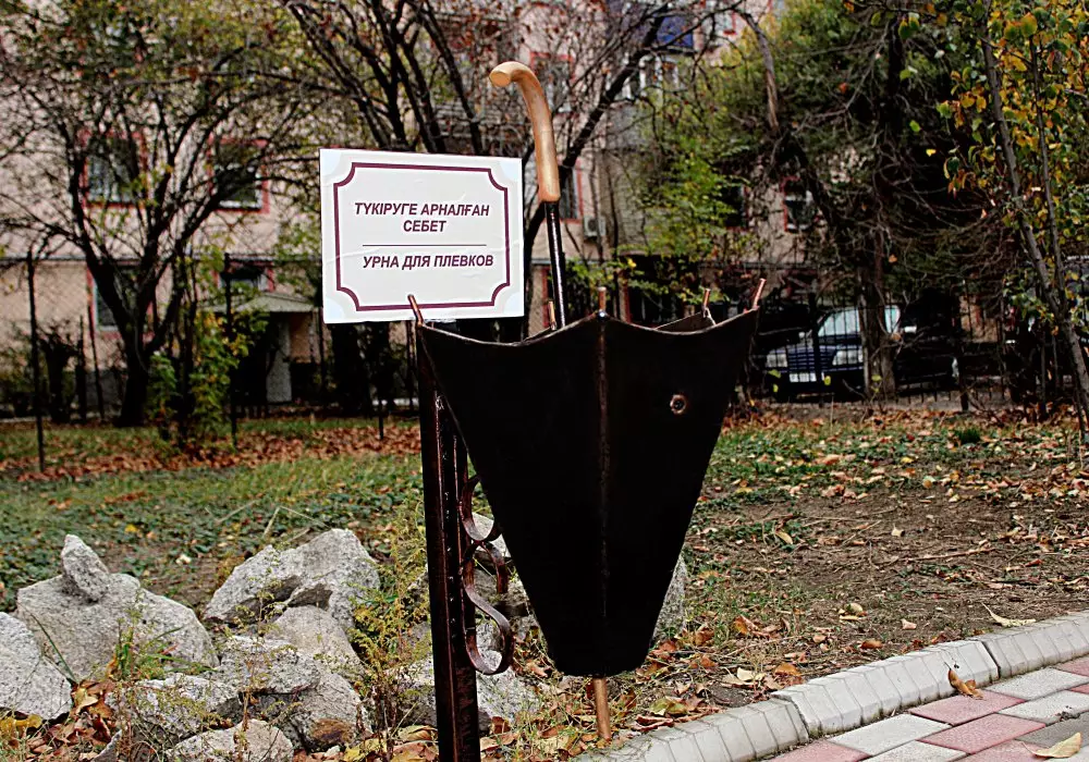 Урна будет выполнена в виде металлического зонта. Как рассказали авторы идеи, именно такой символ городской чистоты и человеческой культуры появится во всех общественных местах Алматы. Идея создать урну для плевков принадлежит благотворительному фонду "Бауыржан" и основателю-руководителю первой и единственной школы практической рекламы в Казахстане Асхату Ускембаеву.