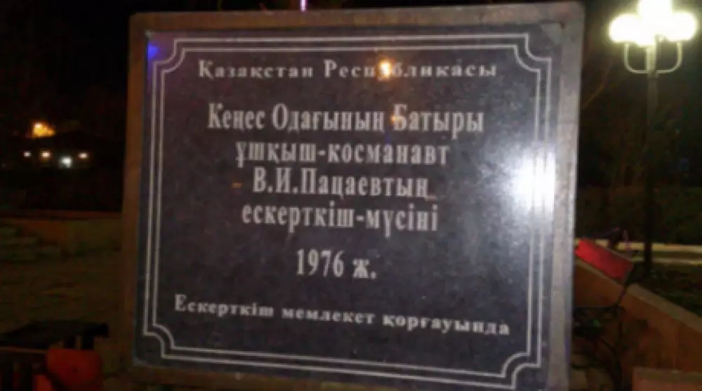 На табличке сделана надпись: "Кеңеc Одағының Батыры ұшқыш-косманавт В.И.Пацаевтын ескерткіш-мүсіні, 1976 жыл" (Памятник летчику-космонавту, Герою Советского Союза В.И. Пацаеву, 1976 год). При этом в надписи на казахском языке указано слово на русском. "А вот по поводу того, что слово "космонавт" на табличке написано не на казахском, так это международный термин. Министерство культуры занималось этим, потому что памятник республиканского значения. Министерство культуры решило подписать на русском", - заявил чиновник.