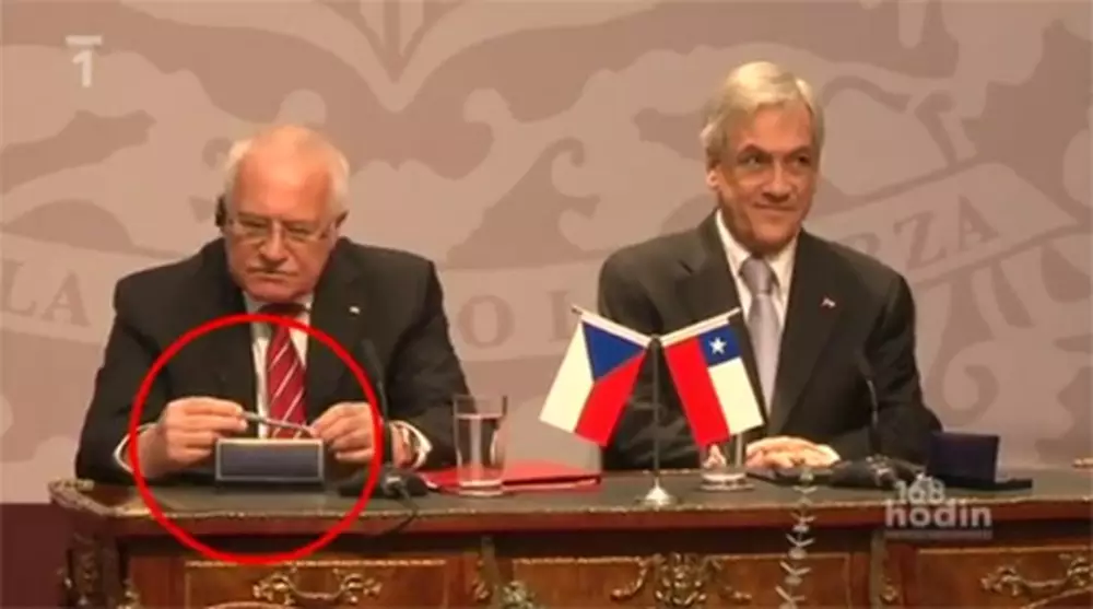 Акция "Соберем ручки для господина президента!!!" развернулась вскоре после того, как в Интернете появилось видео "похищения" чешским президентом протокольной ручки во время встречи со свои коллегой из Чили Себастьяном Пиньерой. На записи видно, как Клаус с невозмутимым видом кладет ручку себе в карман в то время, как Пиньера выступает с речью перед журналистами.