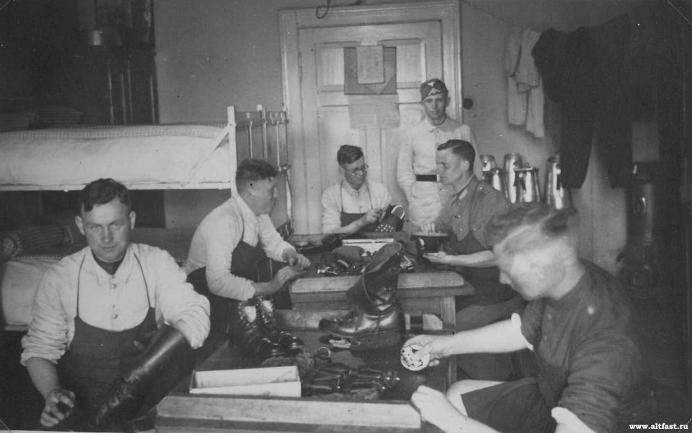 Немецкие солдаты чистят обувь и зашивают одежду.
