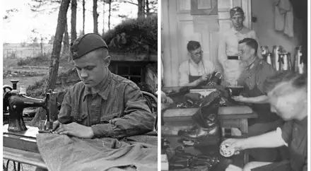 Немецкие солдаты чистят обувь и зашивают одежду.