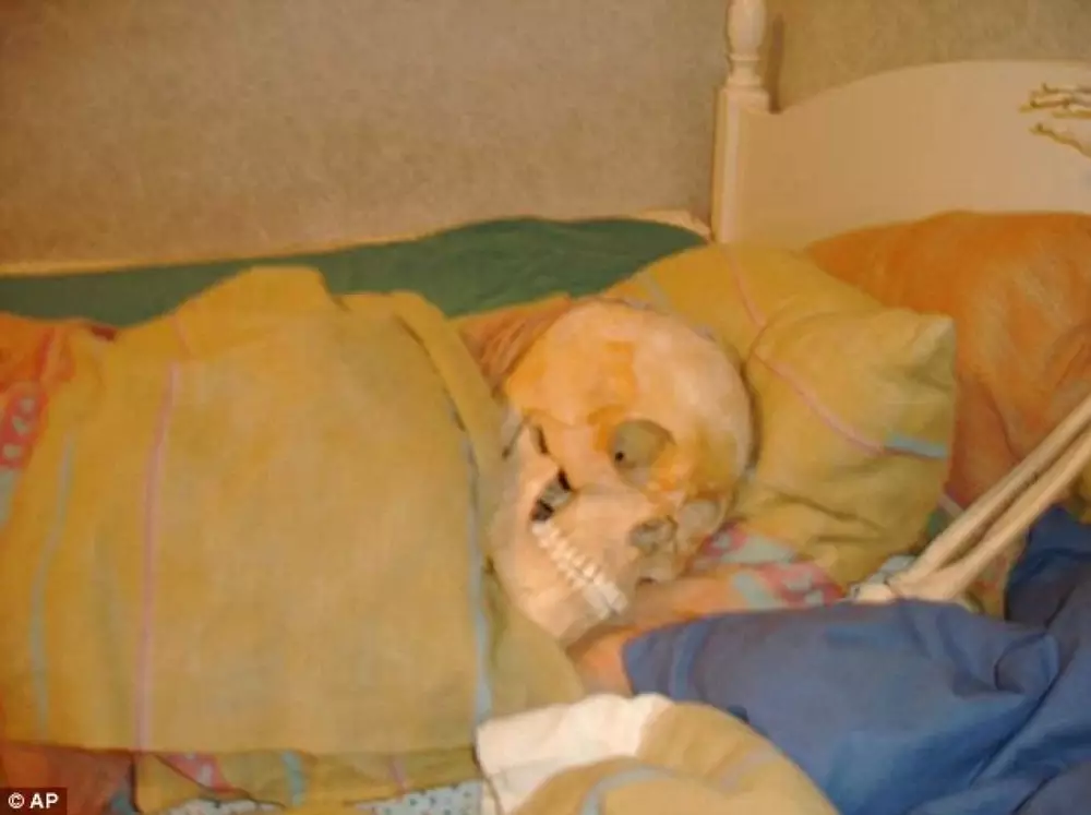 Полиция нашла в квартире женщины несколько черепов, позвоночник и другие кости (всего около 100 фрагментов), которые любовно хранились в разных частях жилища, а также холодное оружие и пистолет. Кроме того, при обыске обнаружились фотографии, на которых женщина "игриво" обращается с черепами - кладет их в постель, обнимает, целует.