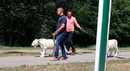 Как оказалось, двое белых львят, которым еще нет и года, принадлежат "Цирку Демидовых", который сейчас расположен на Комсомольском острове. Их прогулку на поводках сфотографировал один из водителей из окна машины.