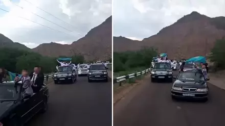На кадрах видно, как молодые люди в костюмах и белых рубашках едут, высунувшись почти в полный рост из окон нескольких автомобилей.