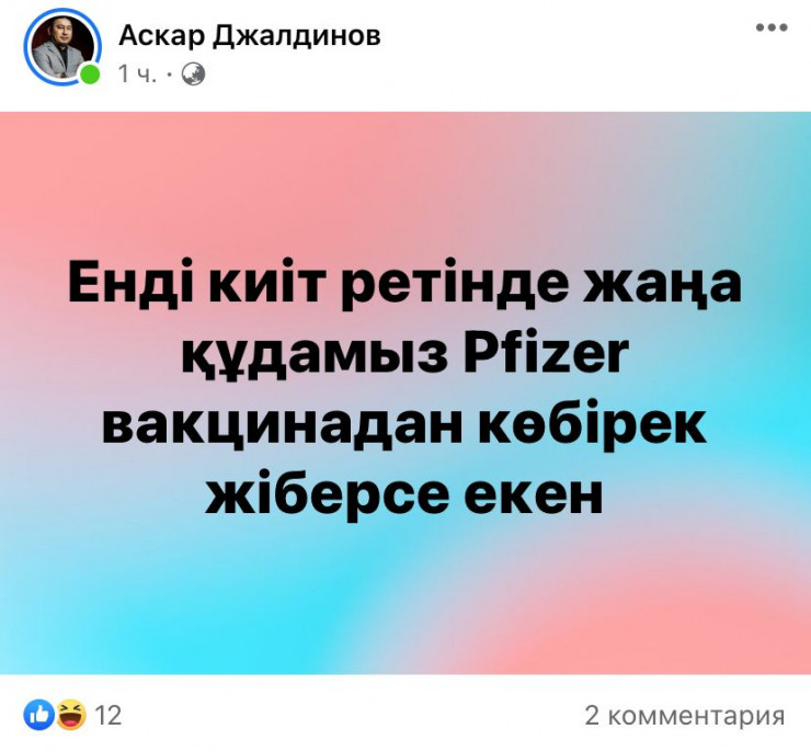 "Енді киіт ретінде жаңа құдамыз Pfizer вакцинасынан көбірек жіберсе екен", - деп қалжыңдаған.