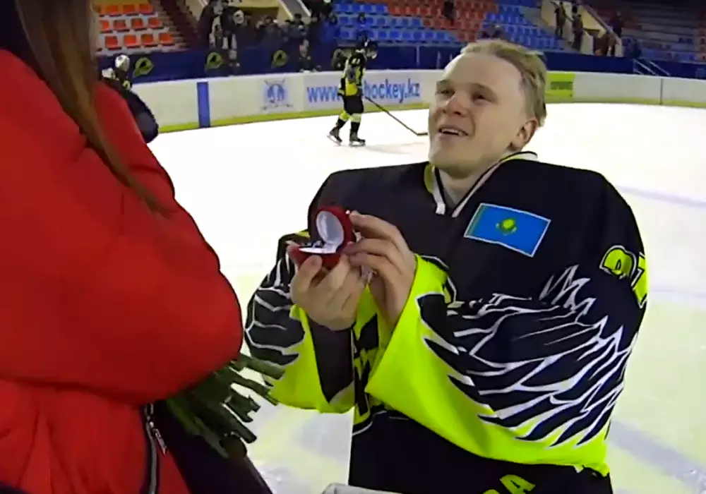 Вратарь хоккейного клуба "Темиртау" оригинально предложил руку и сердце возлюбленной, сообщают Vesti.kz.