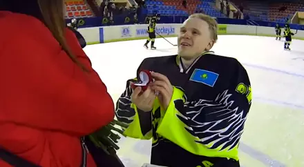 Вратарь хоккейного клуба "Темиртау" оригинально предложил руку и сердце возлюбленной, сообщают Vesti.kz.