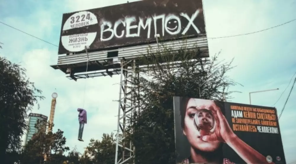 Напомним, о необычной инсталляции стало известно 4 октября 2013 года. Плакат с матерным словом и повешенным манекеном возле Центрального стадиона Алматы провисел недолго. Дизайнер установил его без согласования с властями или владельцами конструкции и инсталляцию сняли после обращения представителей ТОО "Алматы жарнама" (организации, занимающейся учетом и регистрацией наружной рекламы). В управлении языков Алматы отметили, что будут разбираться с ситуацией. Отметим, на плакате художник сообщил о том, что в Казахстане в 2012 году было зафиксировано 3224 случая суицида. Республика, по последней информации, лидирует по показателям совершения самоубийств в СНГ.