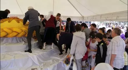 Те, кто не успел к хлебному разбору, настойчиво просили работниц пекарен отдать им лежащие наверху плетеные караваи и румяные калачи. Девушки попытались объяснить, что это муляжи, однако люди не верили и продолжали протягивать руки. Тогда организаторы воскликнули: "Да забирайте, забирайте все до кусочка!" - и раздали бутафорские караваи настойчивым горожанам.