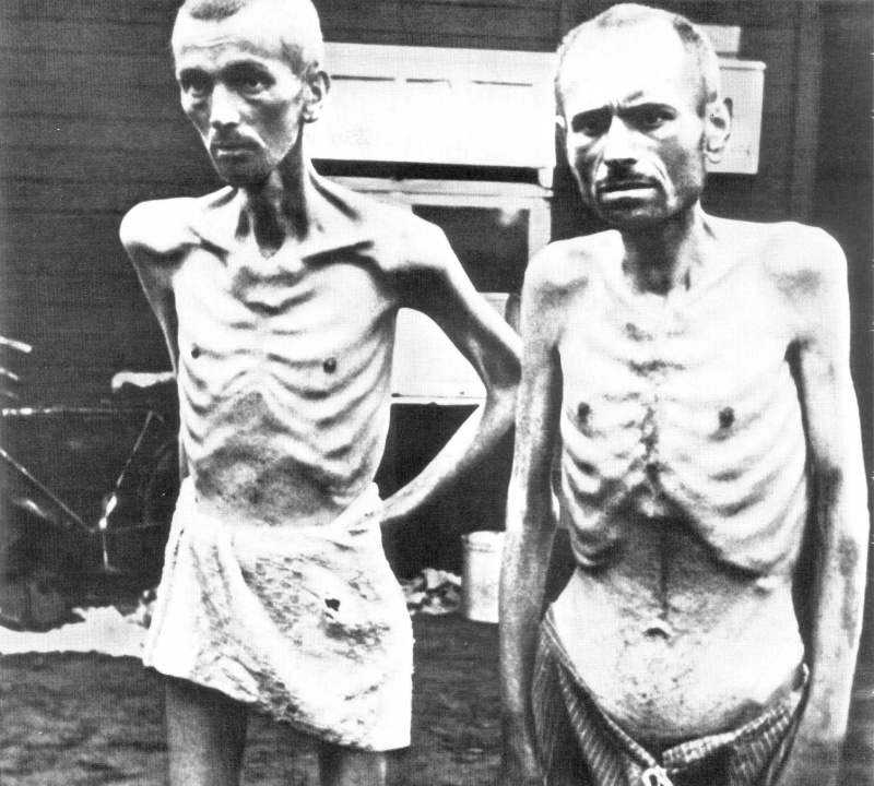 Заключенные концентрационного лагеря смерти Флоссенбург (Flossenburg) после освобождения 97-й пехотной дивизией армии США в мае 1945 года. Изможденный заключенный в центре - 23-летний чех - болен дизентерией. Лагерь Флоссенбург находился в Баварии возле одноименного города на границе с Чехией. Был создан в мае 1938 года. За время существования лагеря через него прошли около 96 тысяч заключенных, из них более 30 тысяч скончались в лагере.