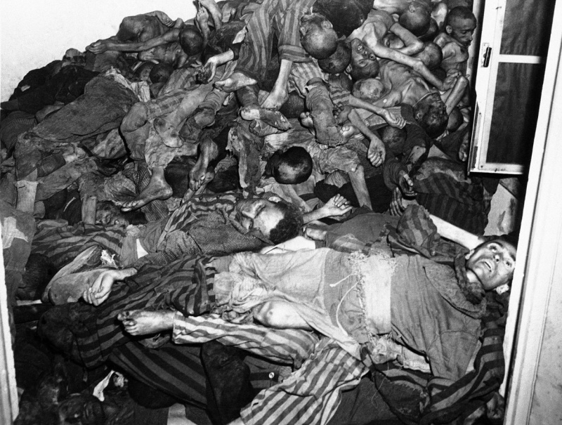 Груда трупов узников в помещении крематория концлагеря Дахау.