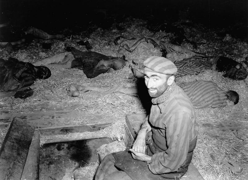 Француз–узник концлагеря Дора-Миттельбау на полу барака среди мертвых товарищей.