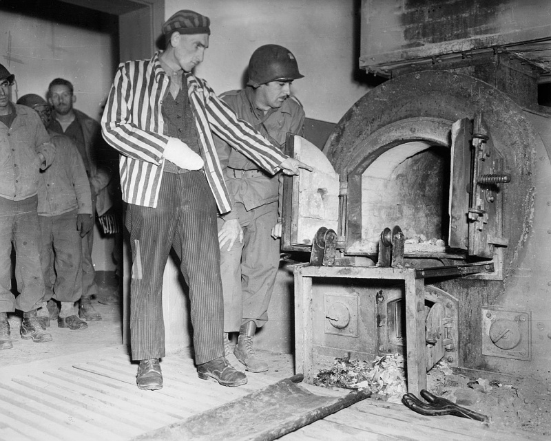 Заключенные демонстрируют процесс уничтожения трупов в крематории концлагеря Дахау.
