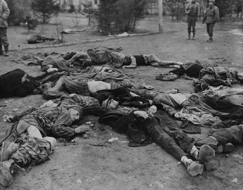 Тела расстрелянных охранников СС у смотровой башни "Б" концентрационного лагеря Дахау.