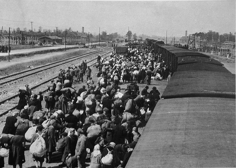 Прибытие эшелона с новыми узниками в концлагерь Освенцим.