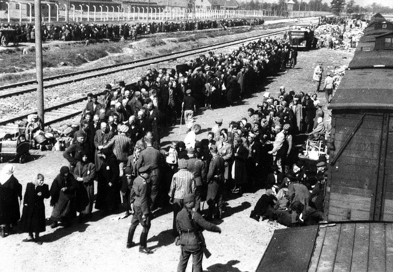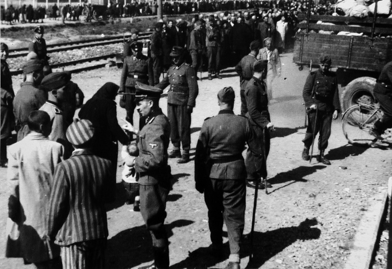 Прибытие заключенных в концлагерь Освенцим. Первый этап отбора. Необходимо было разделить заключенных на две колонны, разделяющие мужчин от женщин и детей.
