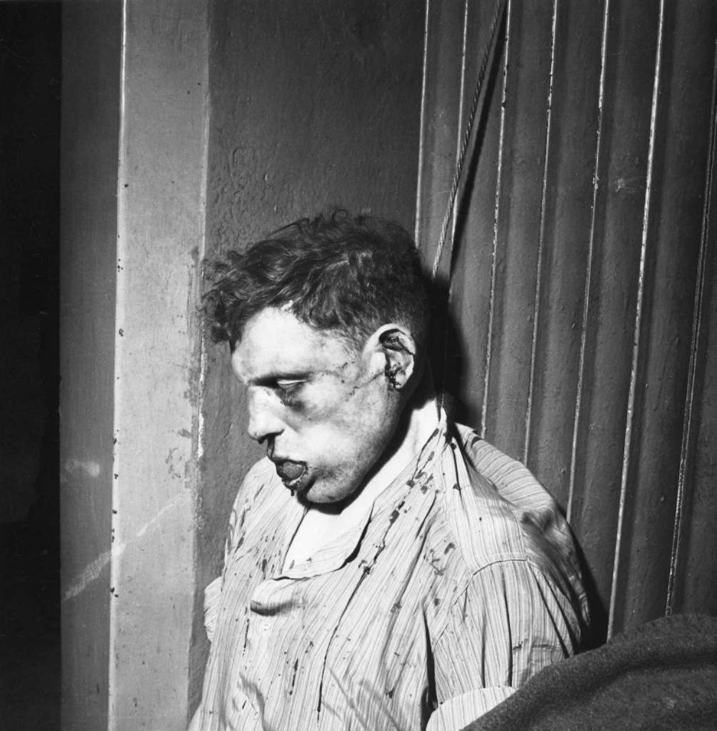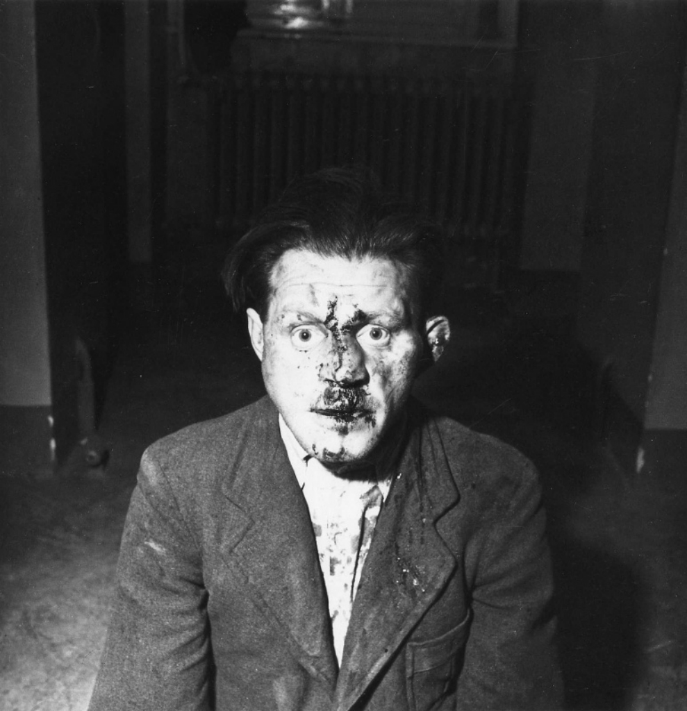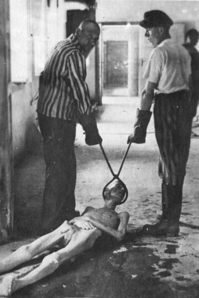 Избитый заключенными неизвестный охранник концлагеря Бухенвальд.