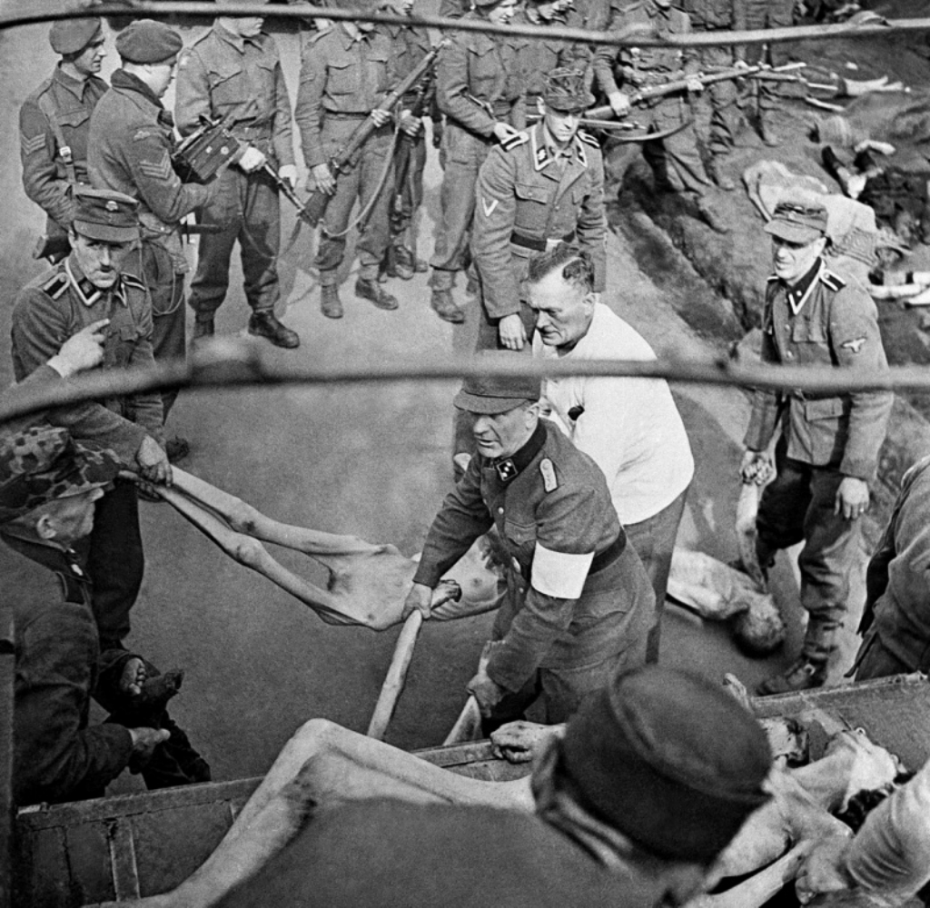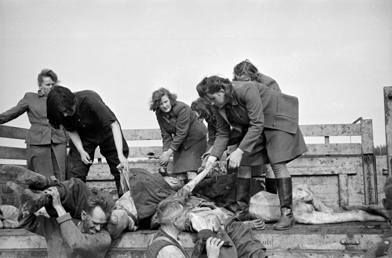Женщины из охраны СС концлагеря Берген-Бельзен разгружают трупы узников для захоронения в братской могиле. На эти работы их привлекли союзники, освободившие лагерь. Вокруг рва - конвой из английских солдат. Бывшим охранницам в качестве наказания запрещено пользоваться перчатками, чтобы подвергнуть их риску заражения тифом.