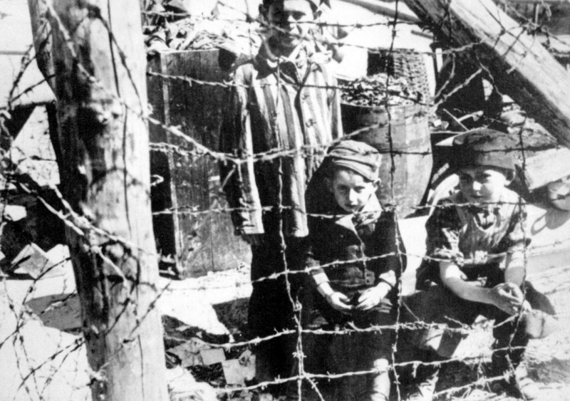 Дети за колючей проволокой в концлагере Бухенвальд после его освобождения.