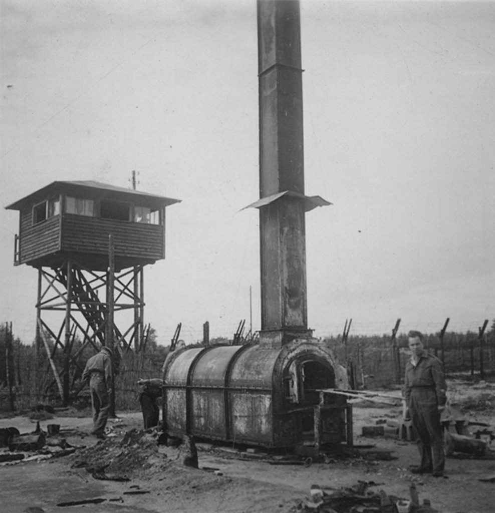 Британские солдаты осматривают печь крематория в освобожденном концентрационном лагере Берген-Бельзен.