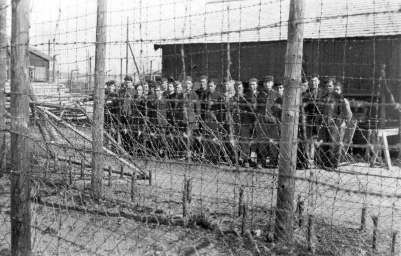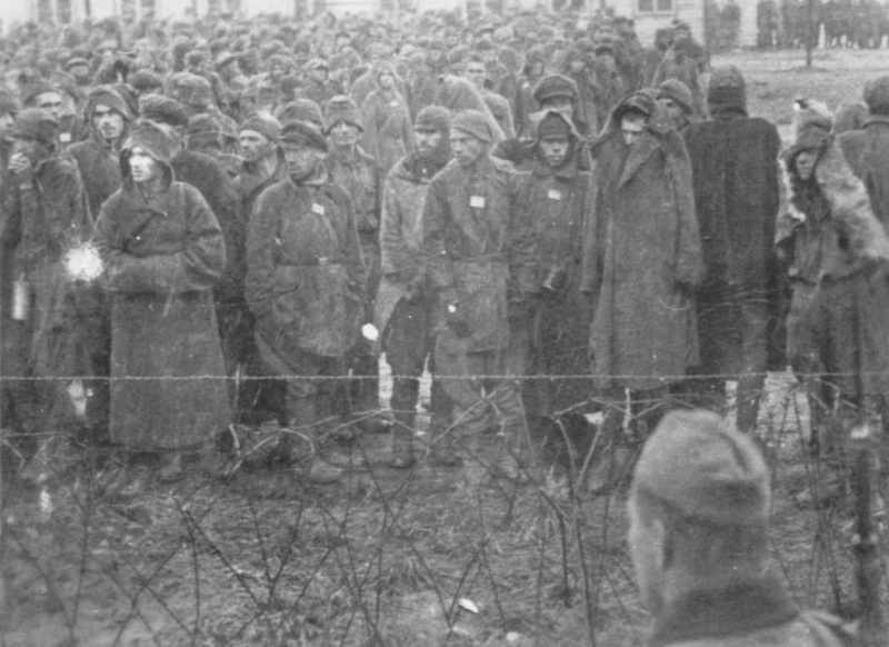 Советские военнопленные у колючей проволоки концентрационного лагеря "Шталаг XVIIIA".