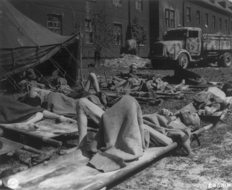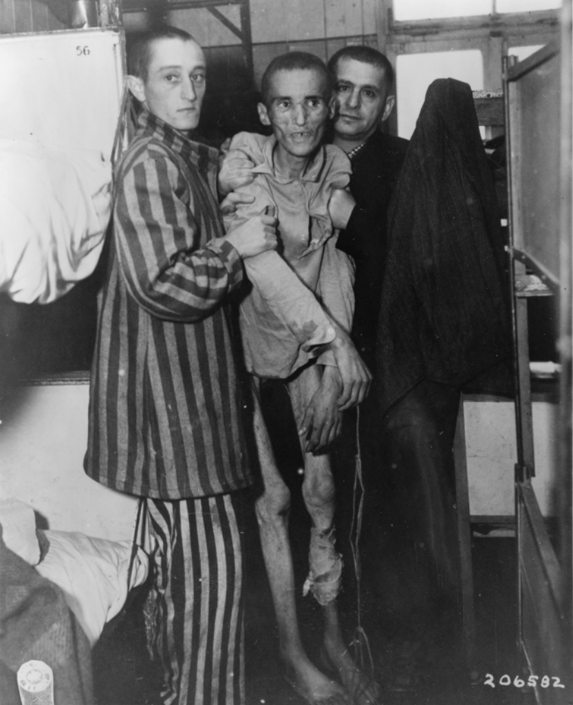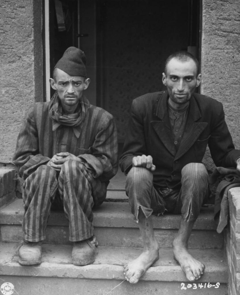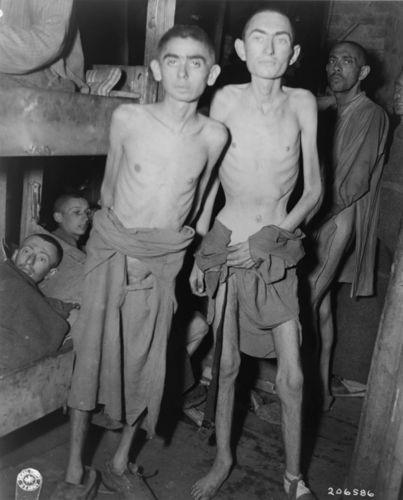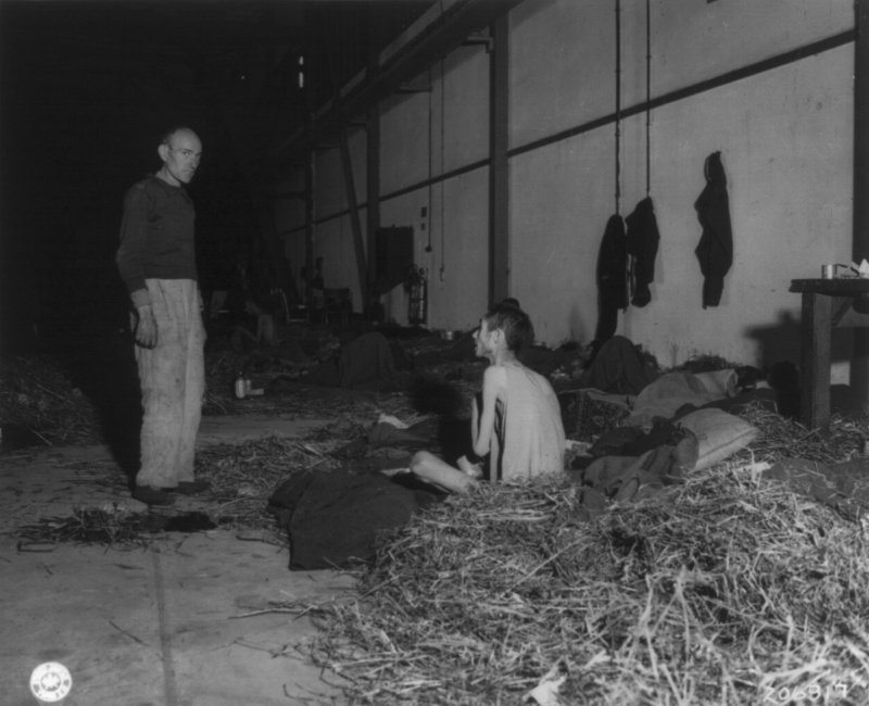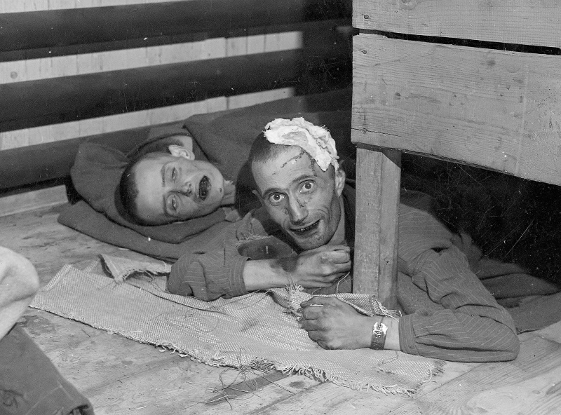 Заключенные концентрационного лагеря смерти Флоссенбург (Flossenburg) после освобождения 97-й пехотной дивизией армии США в мае 1945 года. Изможденный заключенный в центре - 23-летний чех - болен дизентерией. Лагерь Флоссенбург находился в Баварии возле одноименного города на границе с Чехией. Был создан в мае 1938 года. За время существования лагеря через него прошли около 96 тысяч заключенных, из них более 30 тысяч скончались в лагере.