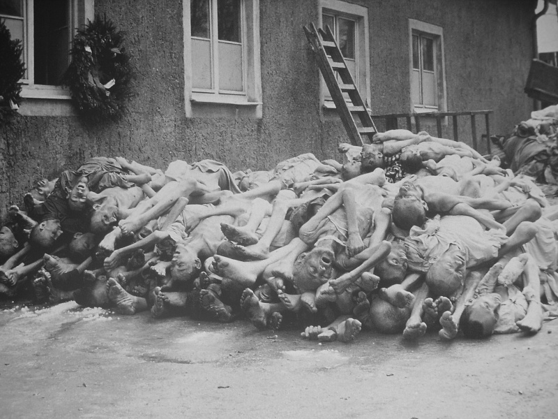 Груда трупов узников в помещении крематория концлагеря Дахау.