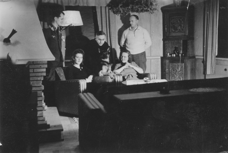 Унтер-офицеры СС К. Денк, Э. Вебер и фельдфебель люфтваффе Р. Вебер с двумя женщинами в комендантском помещении норвежского концлагеря Фальстад.